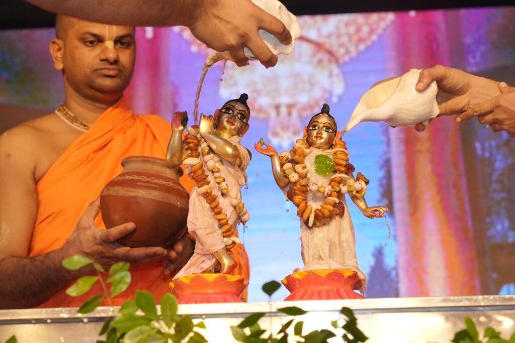 Sri Krishna Janmashtami Kalash Abhishek Seva This Sri Krishna Janmashtami offer prayer to lord with online abhishek Distance is no barrier to devotion. This Janmashtami, let your love flow through the Online Abhishek. On the sacred day of 26th August, your prayers, whispered in the quiet of your home, can be carried to the divine feet of Lord Sri Krishna. Invite peace and spiritual energy into your life by participating in the holy Abhishek. “Wherever there is krishna, there is victory.” – Bhagavad-gita 18.78 Kalasha Abhishek Seva Gold Kalash – ₹51,000 Donate Now Silver Kalash – ₹31,000 Donate Now Bronze Kalash – ₹21,000 Donate Now “One who offers the Deity gifts of land, markets, cities and villages so that the regular daily worship and special festivals of the Deity may go on continually will achieve opulence equal to My own. Śrīmad-Bhāgavatam – 11.27.51 Donate via NEFT/RTGS Only for Indian Citizen/Indian Passport Holder. Bank Name: BANK OF BARODA Branch: Raisen Road, Bhopal 462022 Account Name: ISKCON Account Number: 38880100011073 IFSC Code: BARB0RAIBHO MICR Code: 462012014 Receipts for your donation 80G available as per Income Tax Act 1961 and rules made there under.Tax Exemption Certificate Ref. No.: 23AAATI0017P3ZT To get the receipt of donation made through NEFT, RTGS, IMPS PayTm, UPI as mentioned above, please share your legal name, postal address with pincode (and PAN if you need 80G receipt) along with transaction details on info@iskconbhopal.com. For more information please Call | Whatsapp: +91 86023 16998 from Monday to Saturday between 9:00am to 6:00pm Bhagavad Gita 2.40 In this endeavour of offering service to Lord Kṛṣṇa, you get eternal credit, and a little service offer to Lord Kṛṣṇa can protect one from the most dangerous type of fear. Srimad Bhagavatam 10.11.11 While Kṛṣṇa was going to the fruit vendor very hastily, most of the grains He was holding fell. Nonetheless, the fruit vendor filled Kṛṣṇa’s hands with fruits, and her fruit basket was immediately filled with jewels and gold. Srimad Bhagavatam 10.22.35 It is the duty of every living being to perform welfare activities for the benefit of others with his life, wealth, intelligence and words.