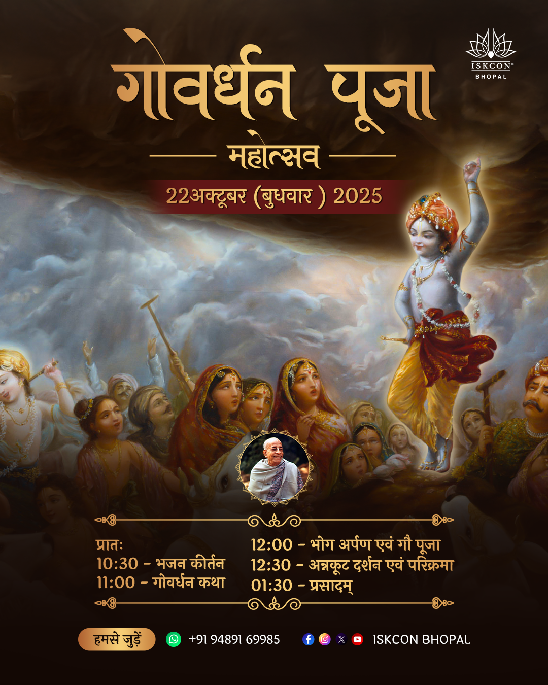 ISKCON Bhopal celebrates Govardhan Puja by offering prayers to Sri Govardhan. On this day, a hill made of rice, sweets and savories is prepared and offered to Sri Giriraj and subsequently distributed to everyone.